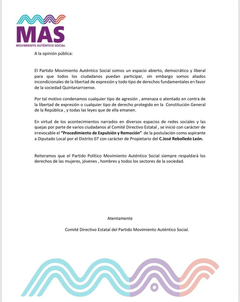 «En virtud de los acontecimientos narrados y el sentir ciudadano, siendo congruentes y fieles a nuestros principios y valores, iniciamos con carácter de irrevocable el “Proceso de Expulsión y Remoción” de la postulación como aspirante a candidato a Diputado Local del D7 con carácter de propietario del C. José Rebolledo León», notificó el partido.