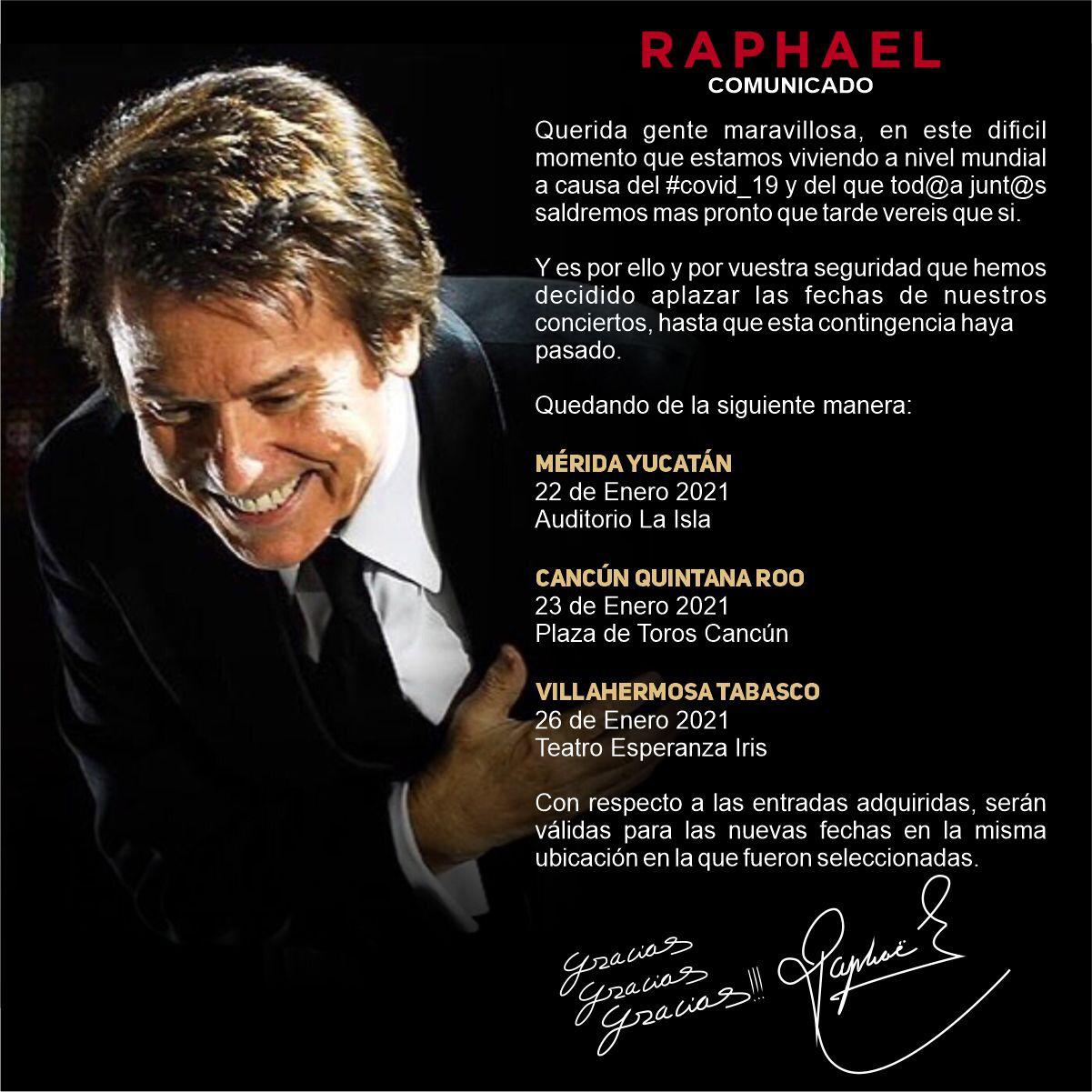 Cancún, Q. Roo, Miércoles 08 de Abril de 2020, poderycrítica.- El cantante español, Raphael, anunció que sus conciertos programados para Cancún Mérida y Villahermosa se realizarán hasta enero de 2021.