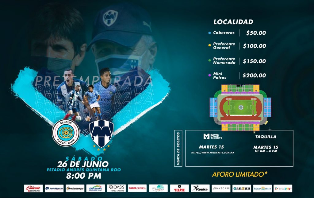 Cancún, Q. Roo, lunes 14 de junio de 2021, poderycrítica.- Cancún FC tendrá un ‘sparring’ de lujo rumbo al Torneo Apertura 2021 de la Liga de Expansión. Ni más ni menos que los Rayados del Monterrey, el próximo sábado 26 de junio a las 20:00 horas en el estadio ‘Andrés Quintana Roo’.