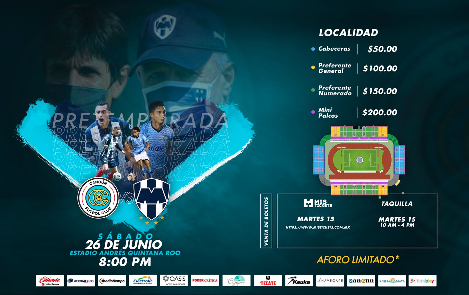 Los precios para adquirir las entradas en taquilla o de manera digital, será de 50 pesos (cabecera), 100 (preferente general), 150 (preferente numerado) y 200 (mini palcos), respectivamente, el cupo para asistir al encuentro será limitado, dependiendo de las disposiciones sanitarias, por el protocolo de Covid-19. Que podría ser similar al implementado con éxito el pasado 7 de abril (jornada 14) en el duelo frente a Leones de la Universidad de Guadalajara.