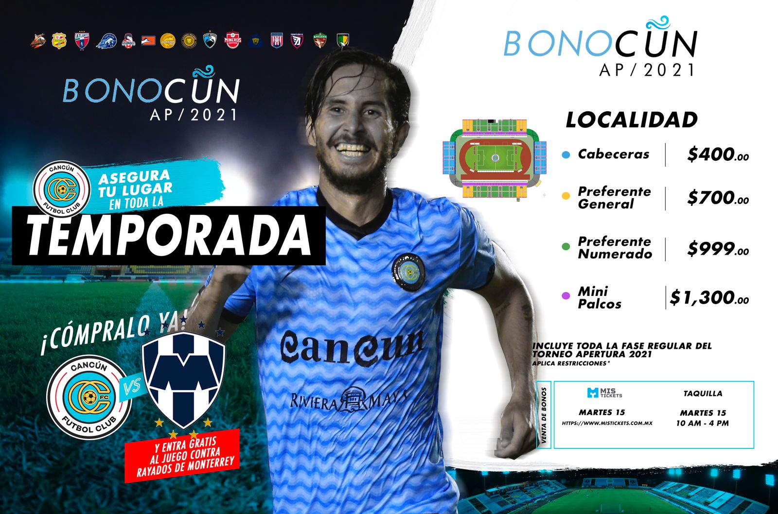 Con base en la localidad de su preferencia, el costo del ‘Bonocun’, por los nueve juegos (en caso de comprarlo a partir del amistoso), será el siguiente: 400 pesos (cabeceras), 700 (preferente general), 999 (preferente numerado) y 1,300 (mini palcos).