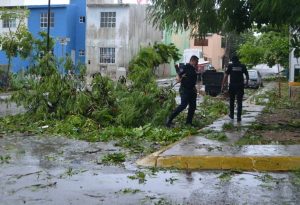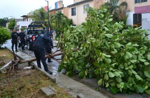 Las brigadas de policías municipales desde muy temprano se dieron a la tarea de limpiar calles y avenidas de Solidaridad para evitar la obstrucción de vialidades, así como de pozos pluviales y alcantarillas de la ciudad.