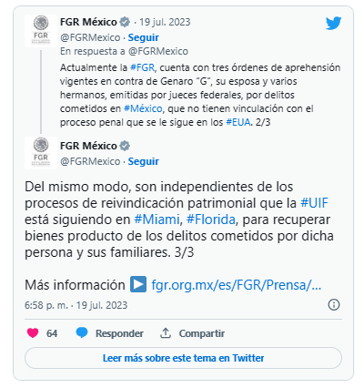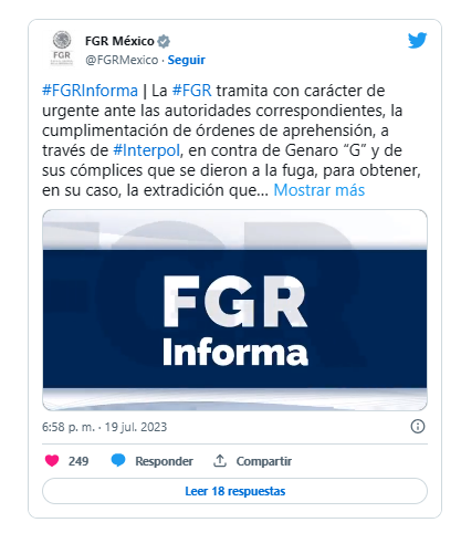 “Y en este expediente, el juez competente libró órdenes de aprehensión también contra la esposa y varios hermanos de Genaro “G” igual que a más de 50 personas involucradas en peculado y operaciones con recursos de procedencia ilícita”, se lee en el comunicado.