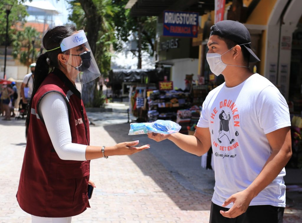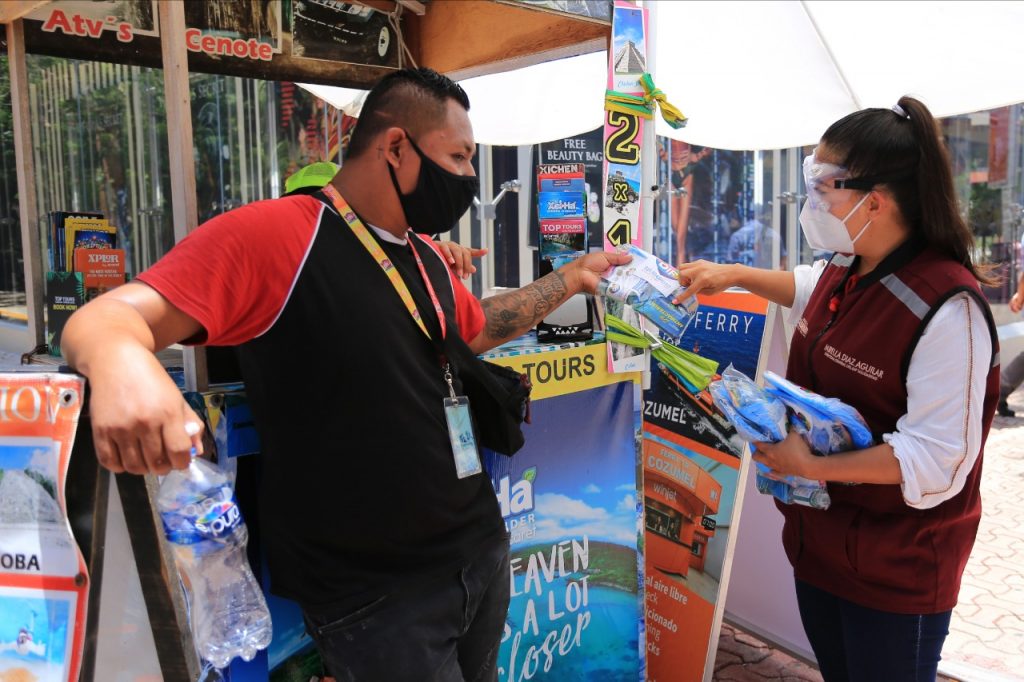 Playa del Carmen, Q. Roo, Jueves 23 de julio de 2020, poderycrítica.- Continúa la entrega de kits sanitizantes a la población por parte del Ayuntamiento de Solidaridad en el marco de la campaña preventiva “Libre de Brotes”. En esta ocasión, se distribuyeron entre comerciantes y locatarios de la Quinta Avenida, para seguir incentivando la reactivación económica del municipio que actualmente cuenta con el 40% de las empresas reabiertas y una ocupación hotelera del 21.7% en la Riviera Maya, de acuerdo con la Secretaría de Turismo del estado.