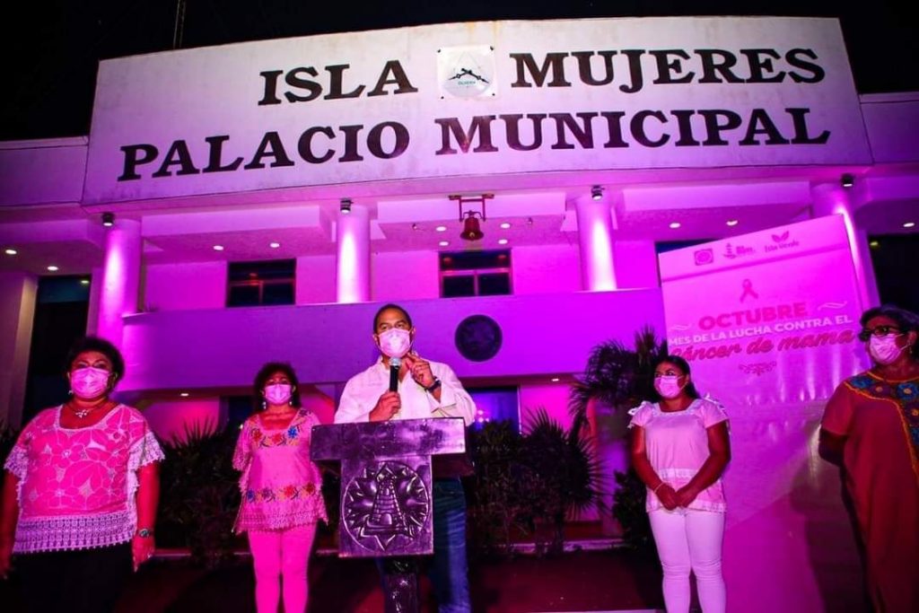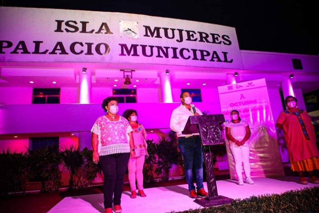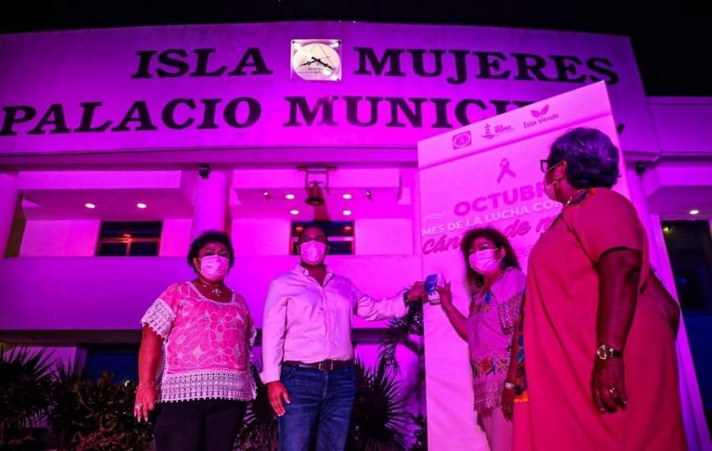 Isla Mujeres, Q. Roo, Viernes 02 de Octubre de 2020, poderycrítica.- En conmemoración al mes de octubre dedicado a la concientización y prevención del cáncer de mama, autoridades municipales encabezadas por el presidente Juan Carrillo Soberanis, realizaron el tradicional “encendido rosa” del edificio del palacio municipal.