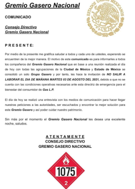 Ciudad de México, Martes 03 Agosto de 2021, poderycrítica.- El Gremio Gasero Nacional entró este martes en paro nacional ante la regulación de precios máximos del gas LP, solicitado por el presidente Andrés Manuel López Obrador, publicó lopezdoriga.com.