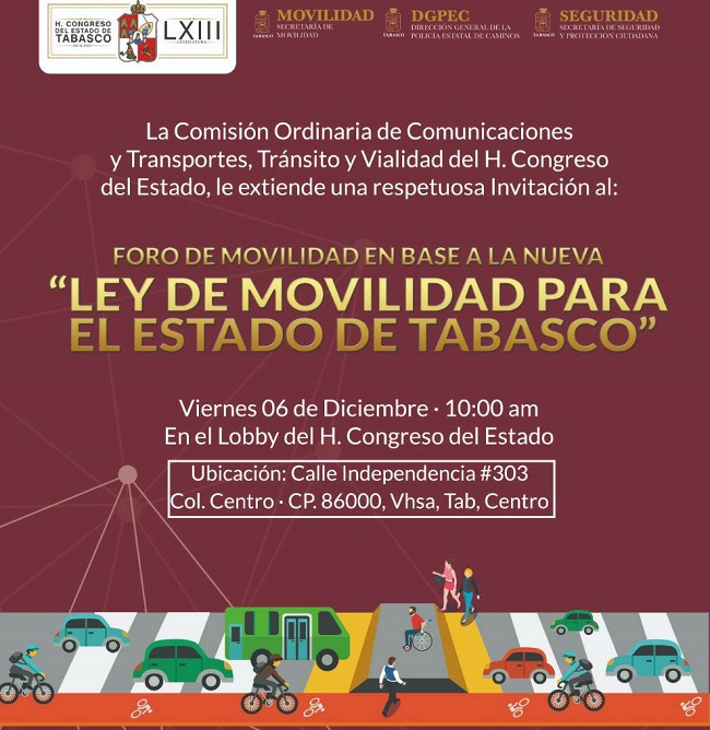 Tabasco, 05 diciembre; poderycritica.-Como un ejercicio para dislucidar la nueva Ley de Movilidad para el Estado de Tabasco e intercambiar experiencias en torno al tema, la Comisión Ordinaria de Comunicaciones y Transportes, Tránsito y Vialidad del Congreso del Estado, que encabeza José Concepción García González, realizará este viernes 06 de diciembre un Foro de Movilidad sobre la nueva ley en la materia.