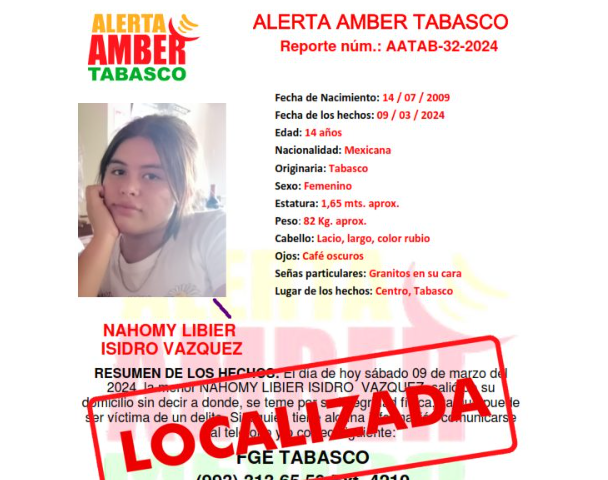 El pasado sábado 9 de marzo, se emitió nuevamente una Alerta Amber para localizar a Nahomy. En esta ocasión, la Fiscalía del estado logró ubicarla y asegurarla para regresarla con su madre, con quien reside en el municipio de Centro.