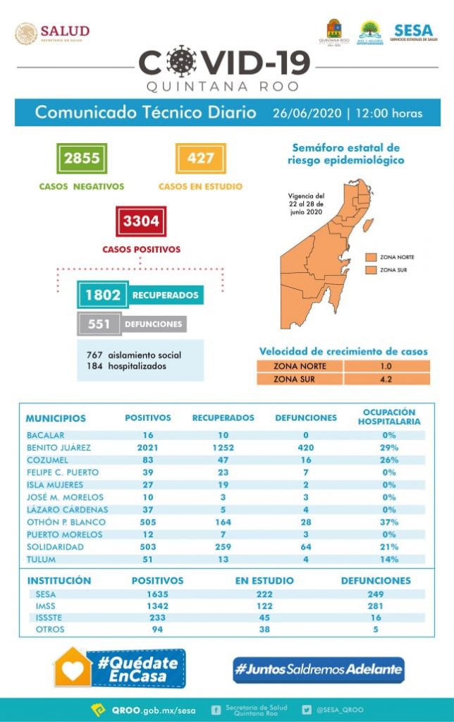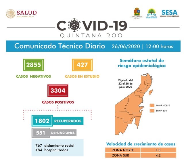 «Hasta las 12 horas del 26 de junio, se han notificado 2855 casos negativos, 427 en estudio, 3304 positivos, 551 defunciones y 1802 personas recuperadas a Covid 19», informó la titular de Salud, Alejandra Aguirre Crespo.
