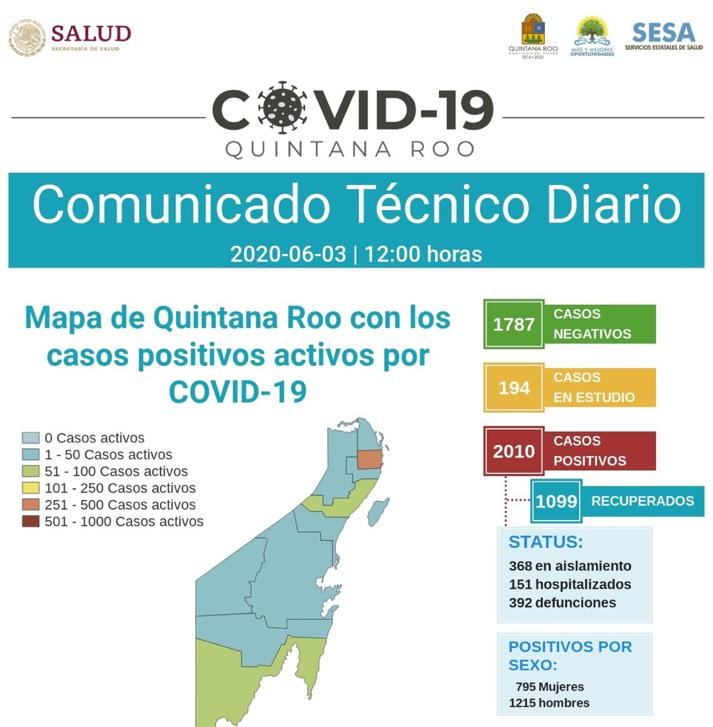 «Hasta las 12 horas del 03 de junio, se han notificado 1787 casos negativos, 194 en estudio, 2010 positivos, 392 defunciones y 1099 personas recuperadas a Covid-19», explicó.