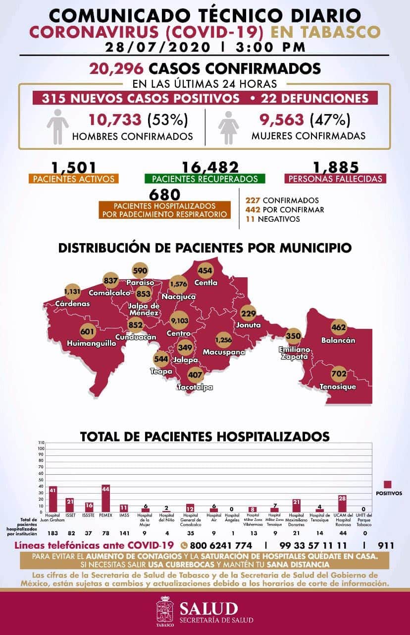 Villahermosa, Tabasco, julio 28.- La barrera de los 20 mil casos positivos de coronavirus fue superada este día en Tabasco.