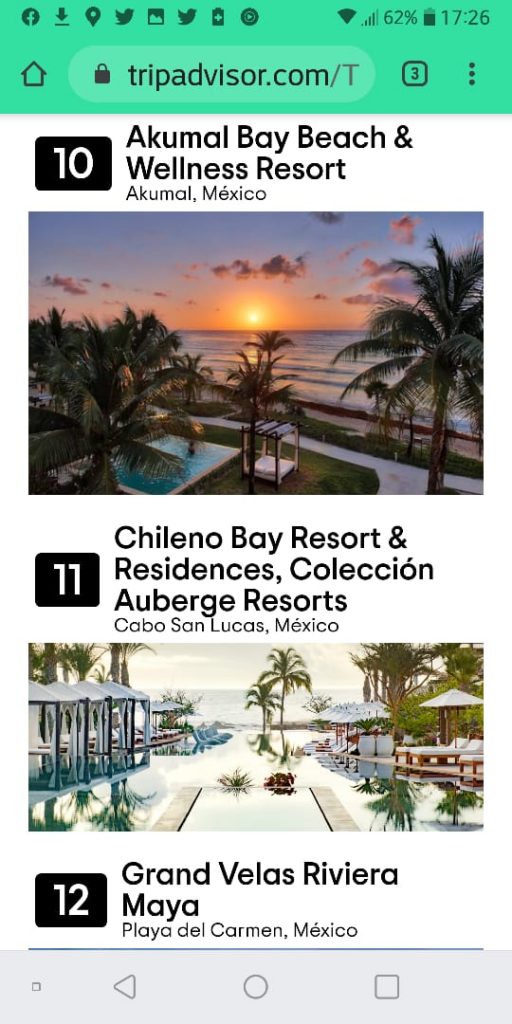 Tulum, Q. Roo, Martes 28 de julio de 2020, poderycrítica.- En la clasificación de los 25 hoteles más populares de México, desde resorts familiares hasta encantadores de boutique que hacen los usuarios de Tripadvisor, el Akumal Bay Resort ocupa el lugar número 10 otorgado por los propios turistas.