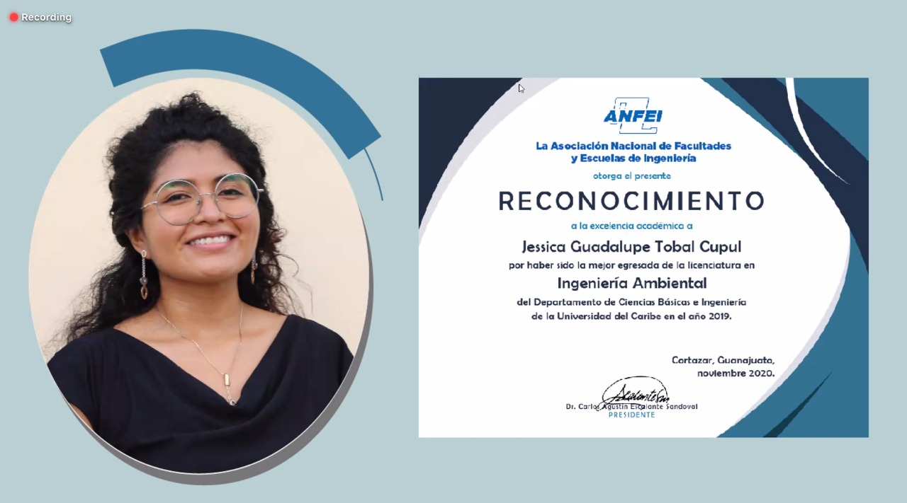 Cancún, Q. Roo, Lunes 09 de Noviembre del 2020, poderycrítica.- La Asociación Nacional de Facultades y Escuelas de Ingeniería (ANFEI), reconoció a la Ing. Jessica Guadalupe Tobal Cupul, como la mejor egresada de Ingeniería Ambiental del Departamento de Ciencias Básica e Ingenierías de la Universidad del Caribe; que días antes fue distinguida como una de las Mejores Instituciones de Ingeniería del País 2020.