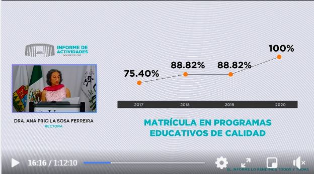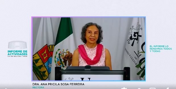 Cancún, Q. Roo, martes 15 de junio de 2021, poderycrítica.- La Rectora de la Universidad del Caribe, Dra. Ana Pricila Sosa Ferreira, rindió el informe de los cuatro años de su gestión, en el que destacó logros en la certificación del 100% de las acreditaciones de los programas educativos; aumento en la matrícula estudiantil y número de egresados; avances en la infraestructura, finanzas sanas, rendición de cuentas y sobre todo, un intenso trabajo para migrar las actividades universitarias a la modalidad a distancia, con motivo de la emergencia por Covid-19.