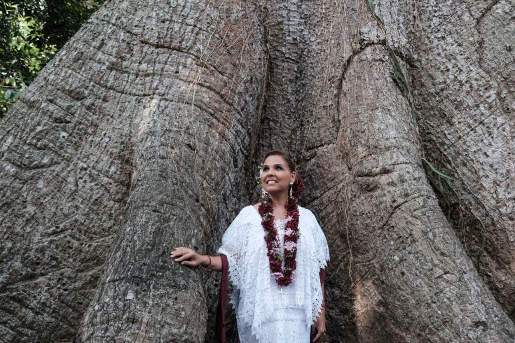 La abanderada morenista se dirigió luego a la ceiba, árbol sagrado de los mayas, cuya edad se calcula en más de 700 años, donde fue recibida entre animadas porras.