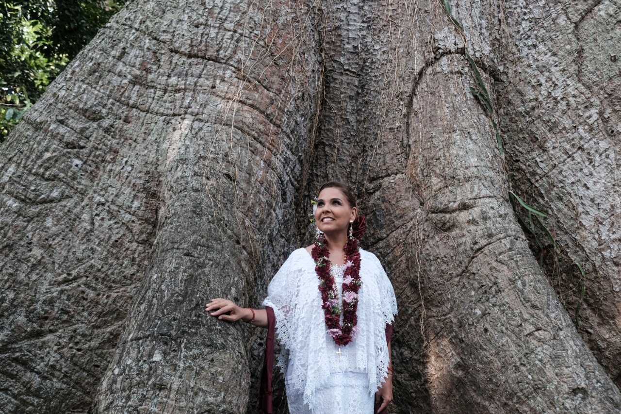Ahí le entregaron un collar de flores guindas y un ramo de flores blancas con rosas rojas y luego se encaminó hasta el árbol, donde fue recibida por dignatarios encabezados por el presidente del Consejo Maya que avaló el nombramiento, Nasiano Poot Chan, junto a una mesa con panes, frutas y agua y el encargado de la ceremonia, Policarpio Pool.
