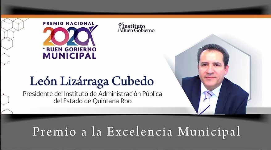 Chetumal, Q. Roo, viernes 04 de Diciembre de 2020, poderycrítica.- El presidente del Consejo del Instituto de Administración Pública de Quintana Roo (IAPQROO), León Lizárraga Cubedo agradeció al “Instituto Buen Gobierno” la distinción otorgada “Premio a la Excelencia Municipal” y a todos aquellos que colaboran para hacer posible el funcionamiento de la Asociación Civil que representa.
