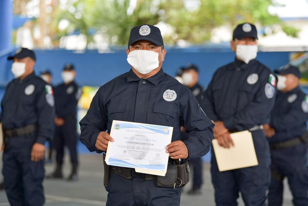 Tulum, Q. Roo, Sábado 30 de enero de 2021, poderycrítica.- Tras reconocer a todos los policías de Tulum por su dedicación, constancia y compromiso a favor de la ciudadanía y su contribución a las labores de prevención durante la pandemia por Covid-19, el presidente municipal, Víctor Mas Tah, hizo entrega de 31 reconocimientos a los elementos con antigüedad en su labor de entre 13 y 21 años, asimismo, 54 policías recibieron su certificado de estudios para acreditar su profesionalización.