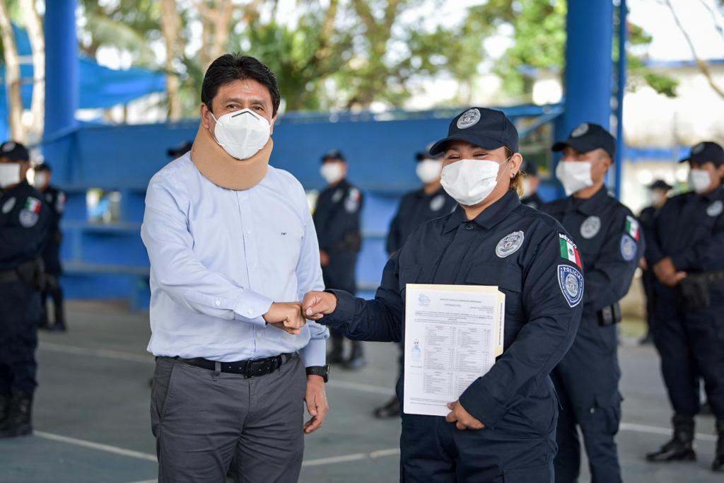 Durante el evento que se llevó a cabo con todas las medidas de salud y sana distancia en el domo del parque Dos Aguas, estuvieron presentes, el Director General de Seguridad Pública, Nésguer Vicencio Méndez; el secretario general del ayuntamiento, Enrique Rodríguez Luna; el primer regidor Keyvin Alegría Santuario y el tesorero municipal, Edgardo Díaz Aguilar, quienes de igual forma reconocieron a los elementos y los felicitaron en el marco del Día del Policía.