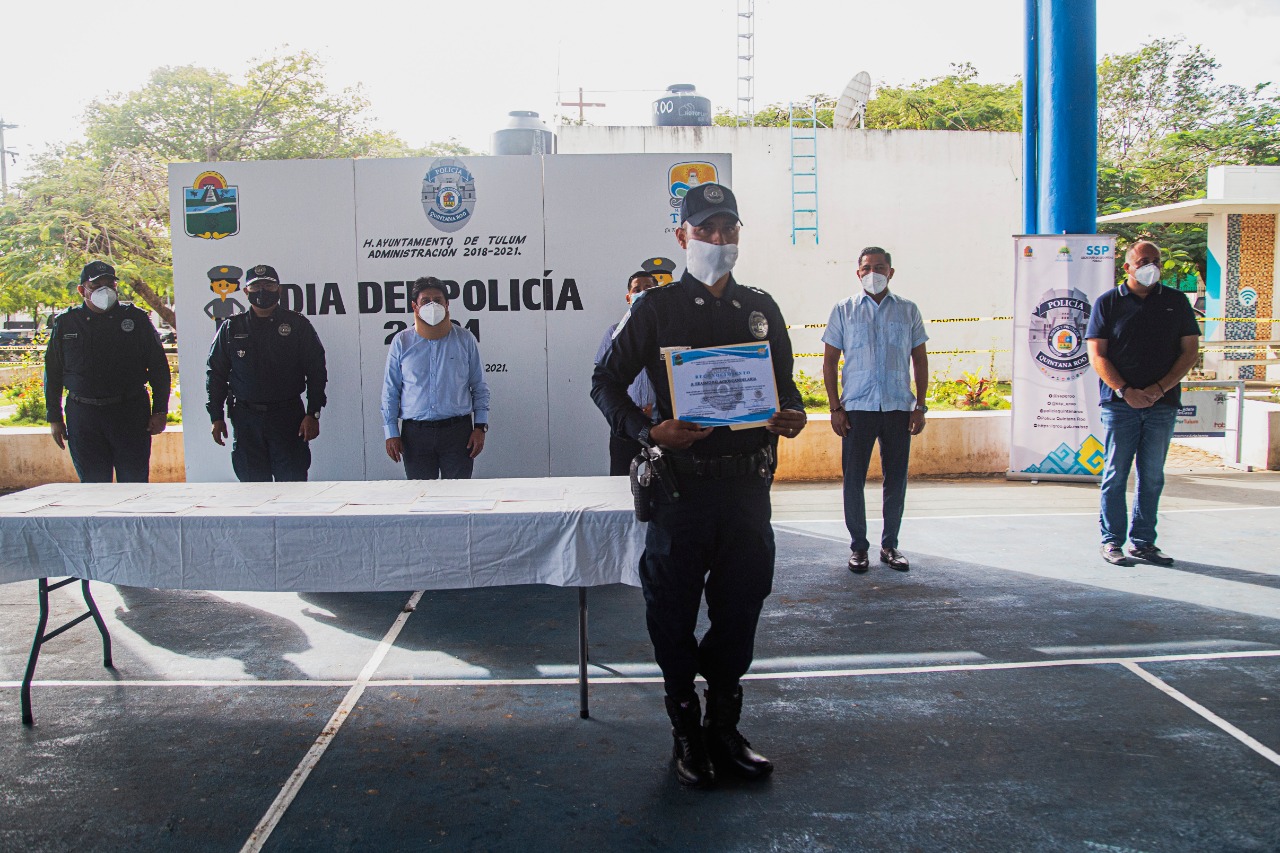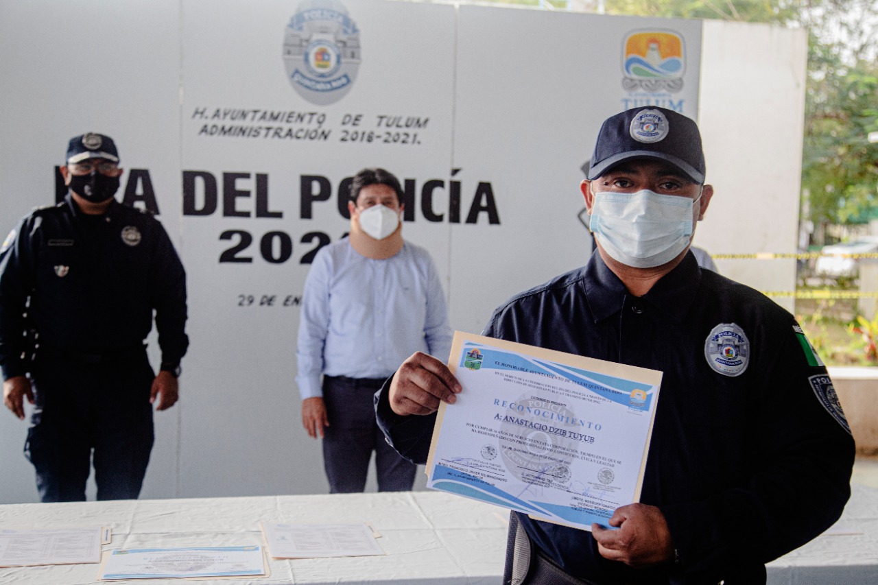 Tulum, Q. Roo, Sábado 30 de enero de 2021, poderycrítica.- Tras reconocer a todos los policías de Tulum por su dedicación, constancia y compromiso a favor de la ciudadanía y su contribución a las labores de prevención durante la pandemia por Covid-19, el presidente municipal, Víctor Mas Tah, hizo entrega de 31 reconocimientos a los elementos con antigüedad en su labor de entre 13 y 21 años, asimismo, 54 policías recibieron su certificado de estudios para acreditar su profesionalización.