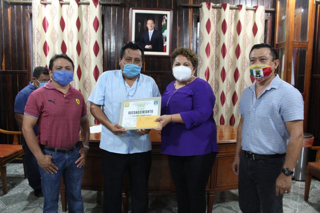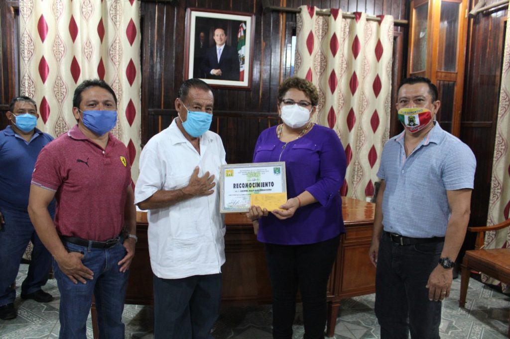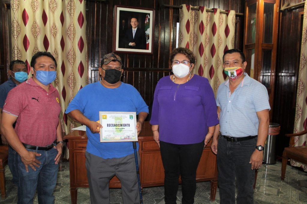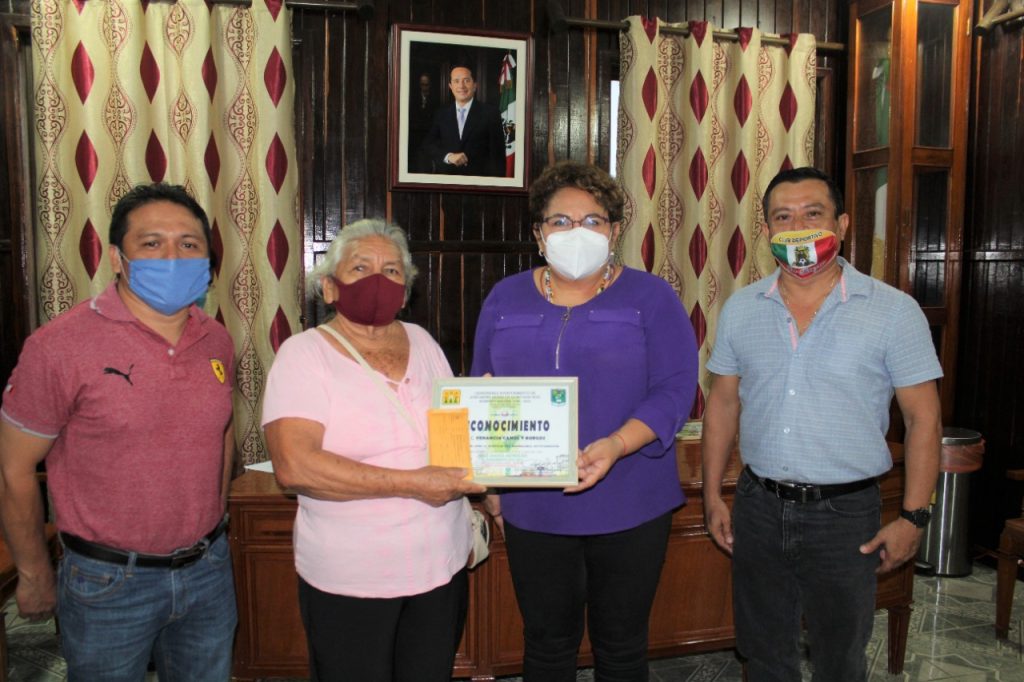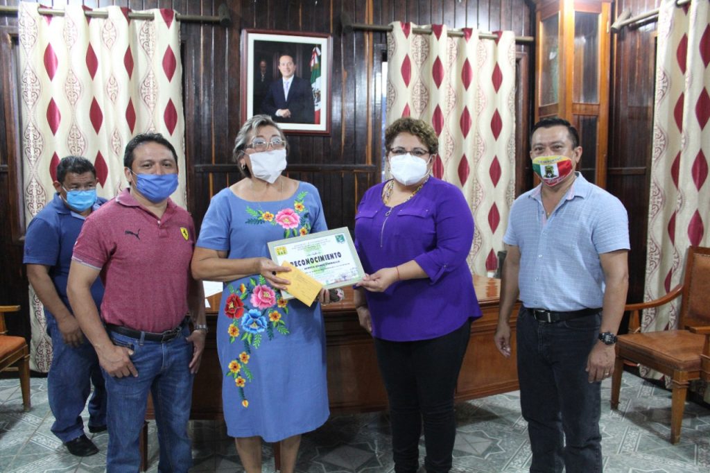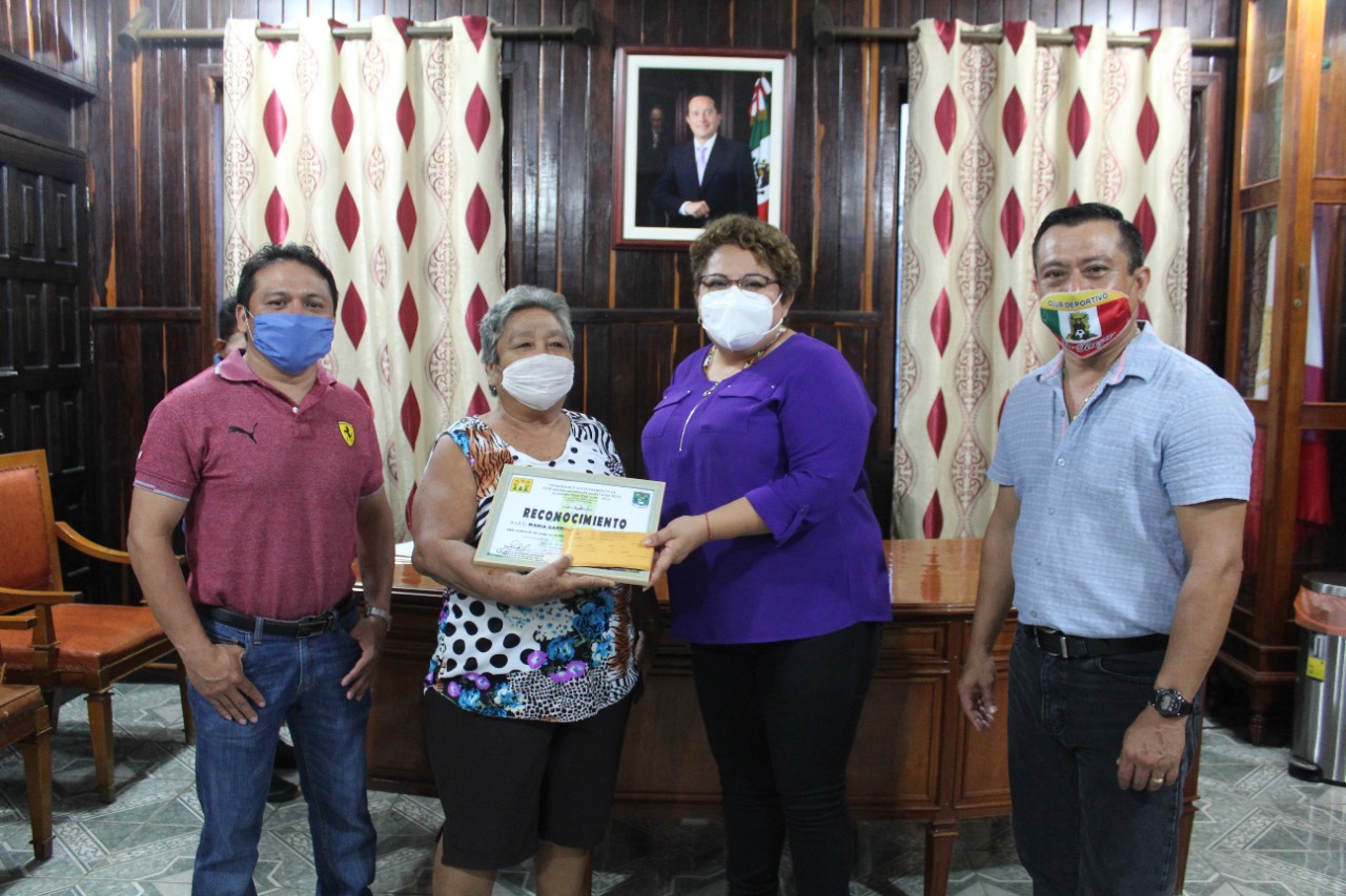 Reunidos en el despacho presidencial cumpliendo los protocolos de seguridad e higiene ante el COVID-19, la alcaldesa morelense entregó reconocimiento y estímulo económico a Daniel Mascote, Norma Pacheco, Luisa Pasos, Olga Dzul, Víctor Uc, Gabriela Urbina, Venancia Canul, Carolina Hernández con 30 años de antigüedad, así como a Mireya Gómez con 25 años, Gregorio con 20 años, Santa Venancia Segovia Puc, y Octavio Cherrez con 15 años de antigüedad.