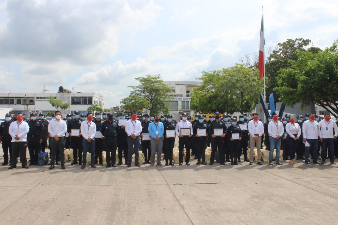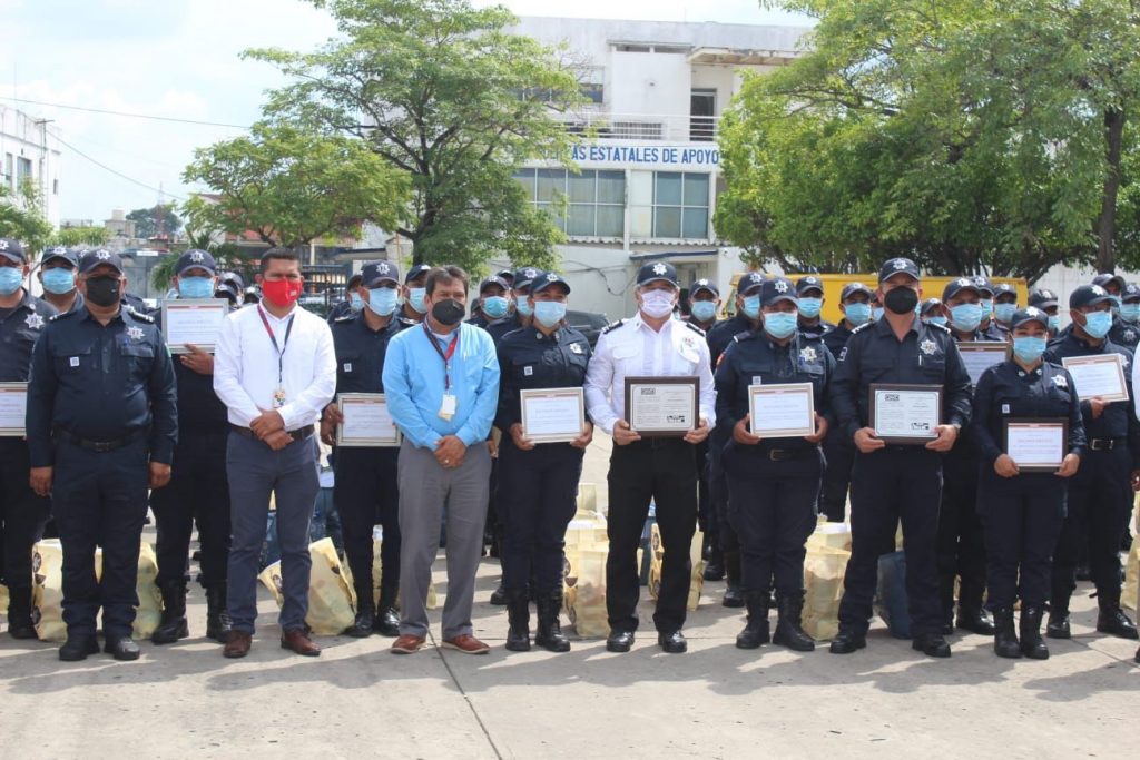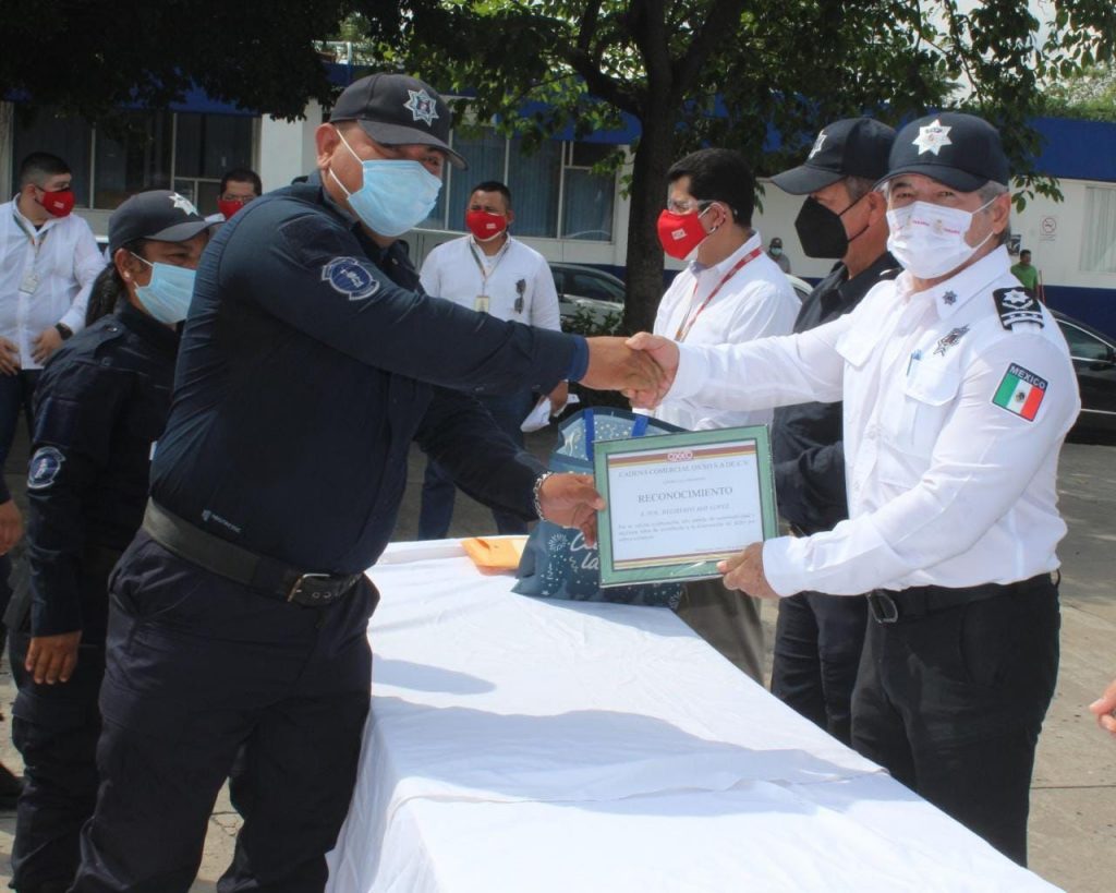 También estuvo presente el Director General de la Policía Estatal, Lic. Leonardo Arturo Leyva Ávalos y mandos operativos quienes fueron testigos del reconocimiento y estímulo que los policías recibieron, la mañana de este viernes.