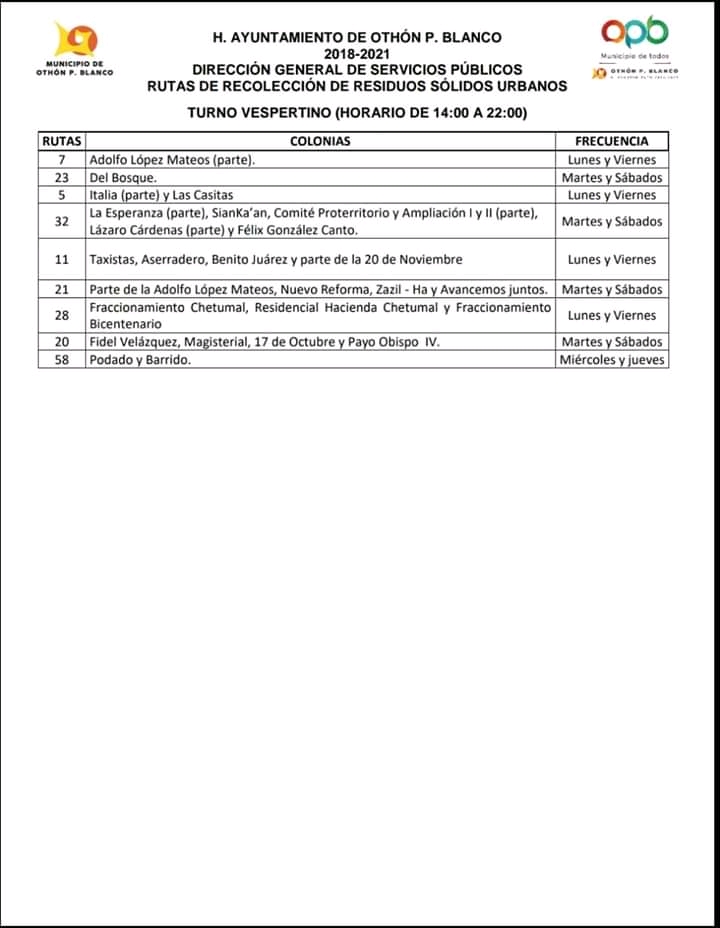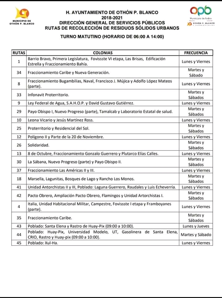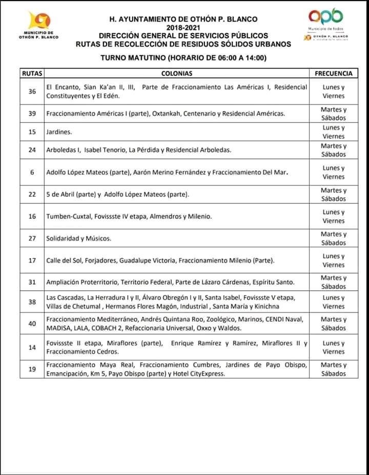 Es así que para algunas colonias el servicio será solo los martes y sábado, mientras que para otras los lunes y viernes. Se incluyen comunidades como Huay-Pix, Xul-Há, Santa Elena y Calderitas.