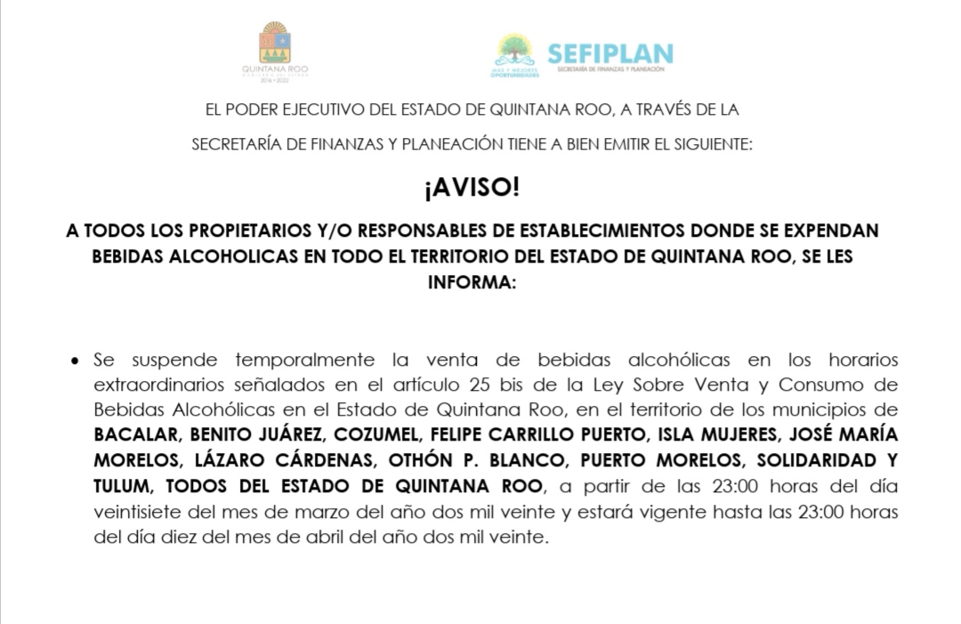 Chetumal, Q. Roo, Jueves 26 de marzo de 2020, poderycrìtica. – La Secretaría de Finanzas y Planeación (SEFIPLAN) del gobierno del Estado emitió un segundo aviso donde se les informa a todos los propietarios y responsables de establecimientos donde se expendan bebidas alcohólicas en todo Quintana Roo, que solo se suspenderán horarios extraordinarios en Quintana Roo, a partir de las 11:00 de la noche del 27 de marzo y la medida concluirá el viernes 10 de abril a las 11:00 de la noche.
