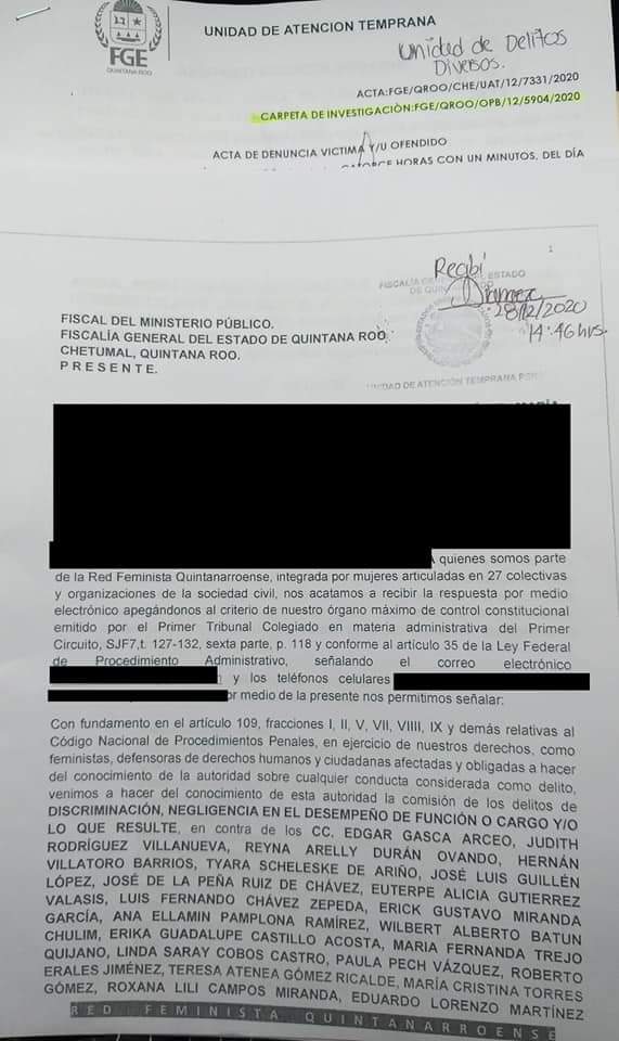 Chetumal, Q. Roo, Lunes 28 de Diciembre de 2020, poderycrítica.- La Red Feminista Quintanarroense (RFQ) interpuso en la Fiscalía General del Estado una denuncia en contra de todos los diputados de la XVI Legislatura del Congreso del Estado.