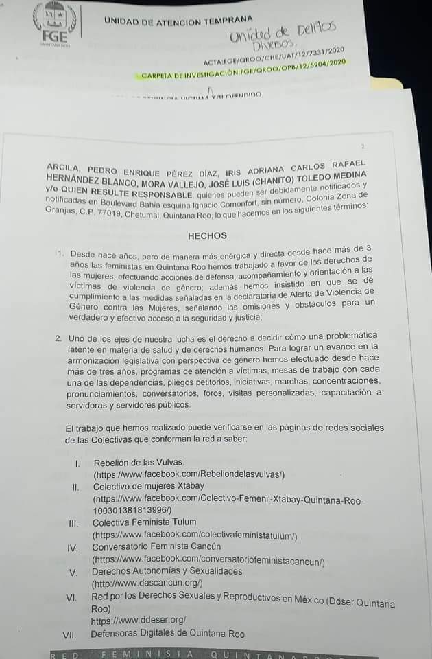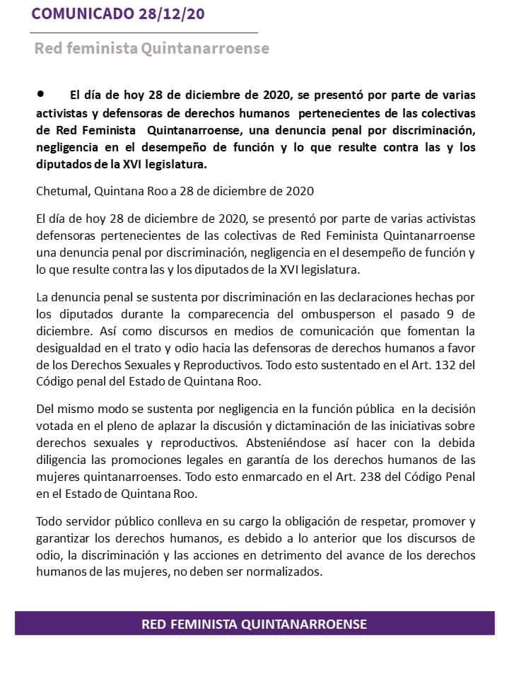 En el texto de la publicación se señala que «Ante las acciones de las que hemos sido víctimas las defensoras de derechos humanos, el día de hoy la Red Feminista Quintanarroense interpuso formal denuncia ante la FGE por el delito de discriminación y negligencia en el desempeño de la función y/o cargo en contra de los diputados y diputadas de la XVI Legislatura del Congreso del Estado de Quintana Roo.
