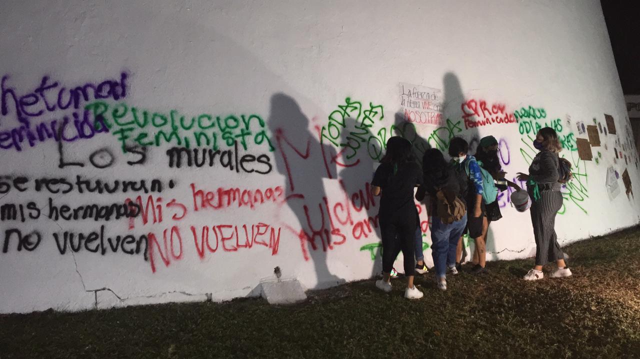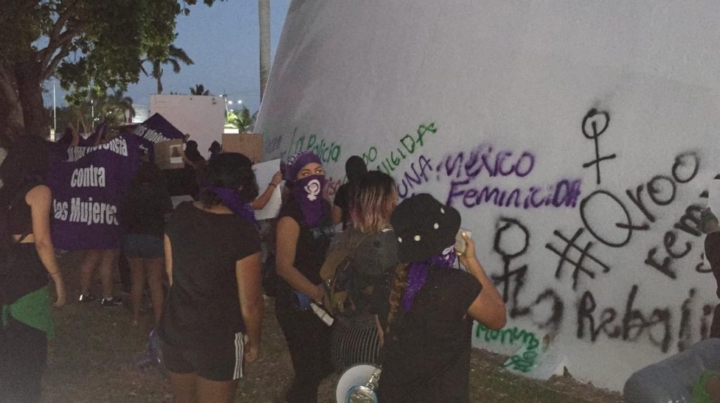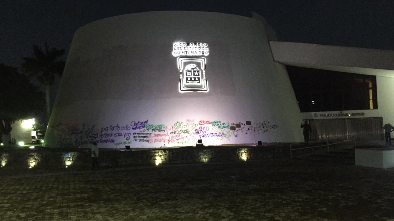 Chetumal, Q. Roo, Jueves 11 de Marzo de 2021, poderycrítica.- En un acto de revancha, integrantes de la Red Feminista Quintanarroense (RFQ), vandalizaron el edificio del Congreso del Estado con grafitis y letreros en reclamo a la destrucción de la “Antimonumento” que colocaron cuando tomaron estas instalaciones hace unos días.