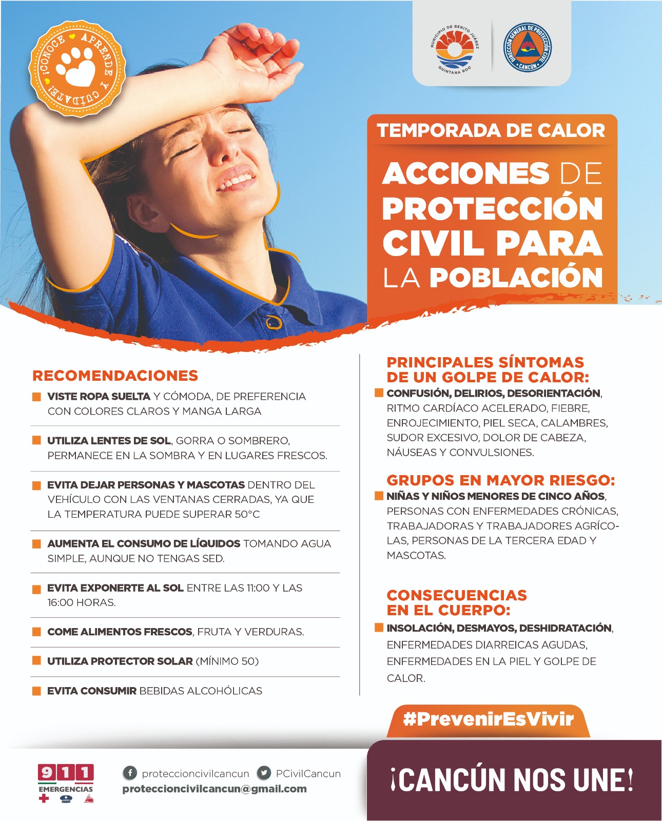 Como parte de la transformación en Cancún y por instrucciones de la Presidenta Municipal, Ana Paty Peralta, el director de la dependencia, Antonio Riveroll Ribbon, dio a conocer que entre los principales síntomas de un “golpe de calor” destacan: confusión, delirios, desorientación, ritmo cardíaco acelerado, fiebre, enrojecimiento, piel seca, calambres, sudor excesivo, dolor de cabeza, náuseas y convulsiones.