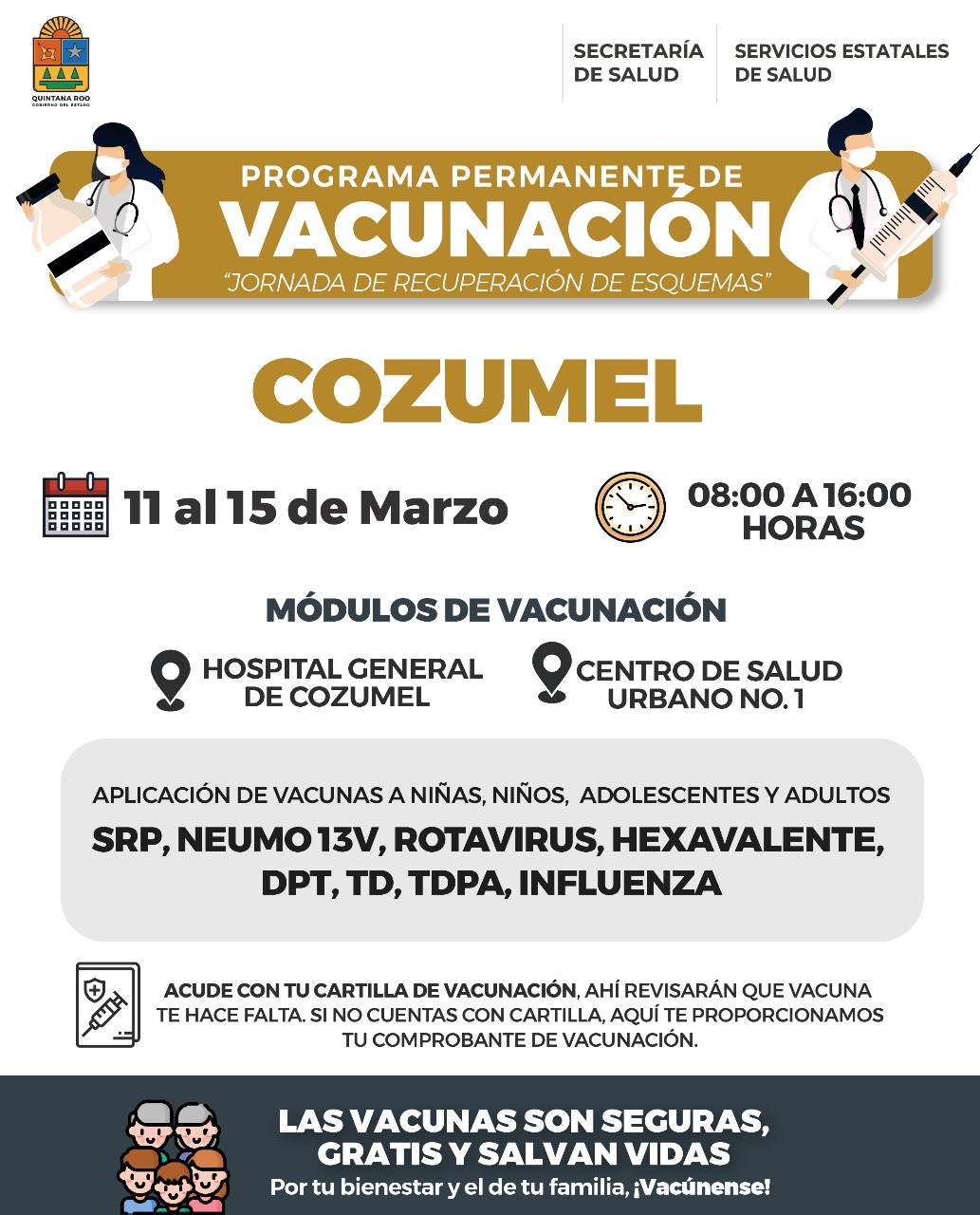Los módulos de vacunación de esta jornada, que forma parte jornada del Programa Permanente de Vacunación, funcionan en el Hospital General de Cozumel y en el Centro de Salud Urbano número 1, en horario de 8 a 16 horas.