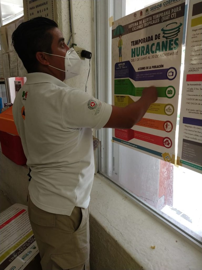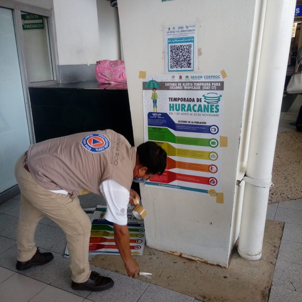 Personal de Protección Civil del Estado, se encuentra recorriendo tanto en el sur como en el norte de la entidad, centros comerciales y lugares con afluencia de gente para colocar carteles informativos en español e inglés del Sistema de Alerta Temprana de Ciclones Tropicales (SIAT-CT). Además, las direcciones municipales de Protección Civil quienes en días pasados recibieron de parte de la Coordinación carteles y trípticos informativos, también están reforzando estas acciones informativas.