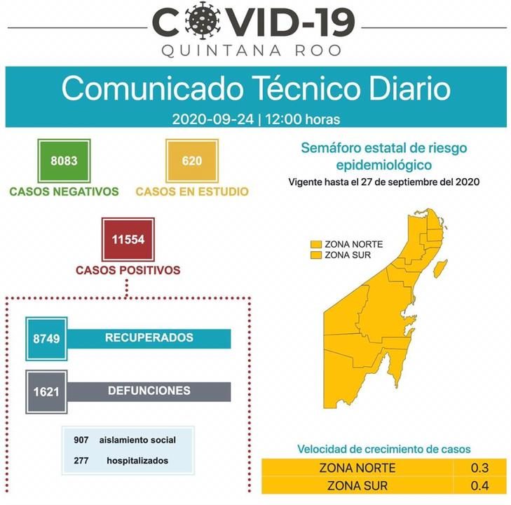 Chetumal, Q. Roo, Jueves 24 de septiembre de 2020, poderycrítica.- de acuerdo a los datos emitidos por la Secretaría de salud en Quintana Roo, existen 11,554 casos positivos de los cuales 1621 han perdido la batalla ante este mal.