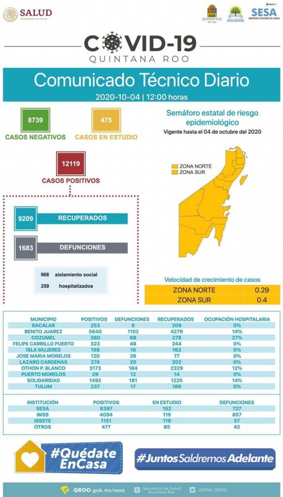 Chetumal, Q. Roo, Domingo 04 de Octubre del 2020, poderycrítica.- Ya son 12,119 casos positivos por coronavirus, de los cuales 1683 personas han perdido la vida por este mal.