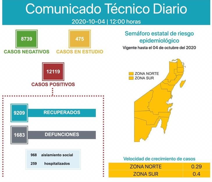 Chetumal, Q. Roo, Domingo 04 de Octubre del 2020, poderycrítica.- Ya son 12,119 casos positivos por coronavirus, de los cuales 1683 personas han perdido la vida por este mal.