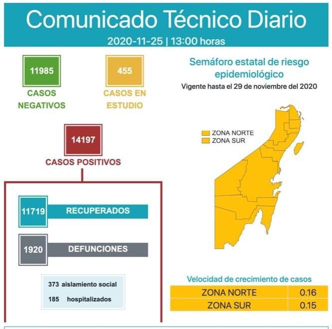 Cancún, Q. Roo, Miércoles 25 de Noviembre del 2020, poderycrítica.- De los 14,197 casos positivos registrados por COVID-19 en Quintana Roo 1920 personas han perdido la vida.