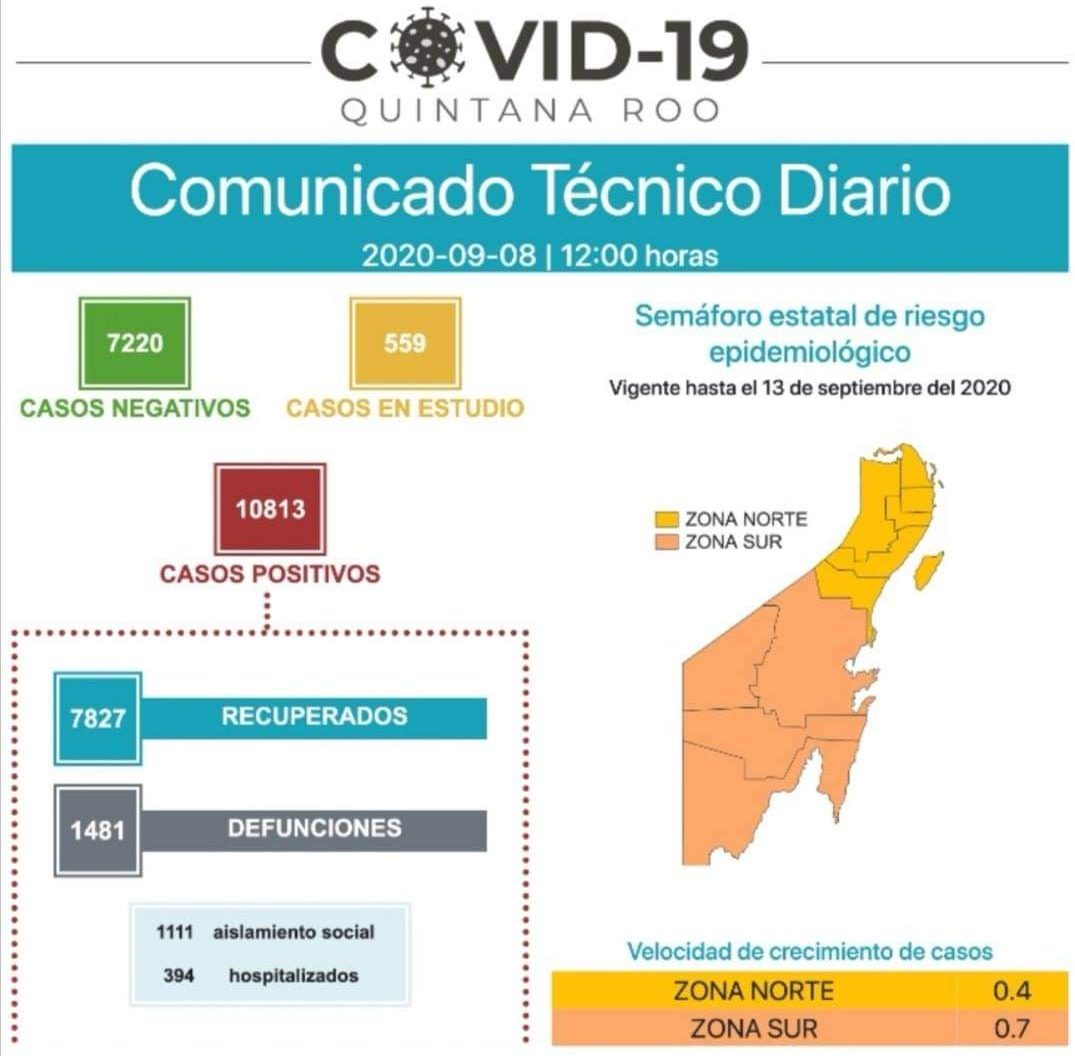 Cancún, Q. Roo, Martes 08 de Septiembre de 2020, poderycrítica.-Tras el reporte técnico de la Secretaría de salud, existen 10,813 casos positivos, 140081 de funciones, 7827 personas recuperadas, 559 casos en estudio.