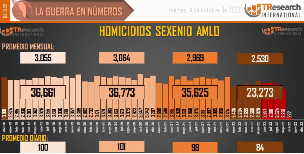 El mes con el mayor registro de homicidios dolosos fue octubre de 2020, con 3 mil 347; en cambio, el mes con menor registro de homicidios dolosos fue septiembre de 2022 con 2 mil 261 eventos, frente a febrero de 2021, considerado por las propias autoridades como el mes con menos asesinatos.