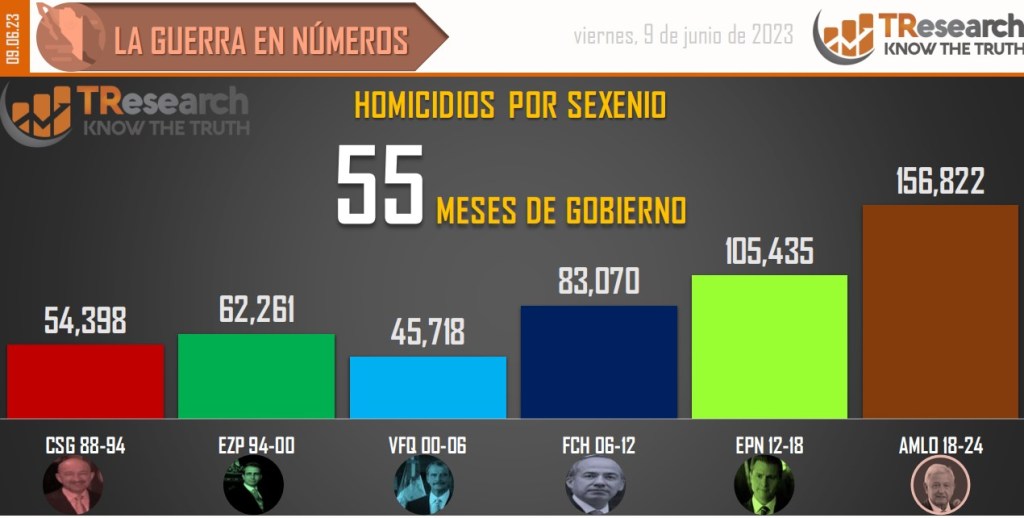 PODER Y CRÍTICA | REDACCIÓN | El reporte ‘MX: La Guerra en Números’, de T-ResearchMX, detalla que, de acuerdo con el registro de homicidios dolosos de la Secretaría de Seguridad y Protección Ciudadana, del 1 de diciembre de 2018 al 8 de junio de 2023, tiempo que lleva la Administración del presidente Andrés Manuel López Obrador, las fiscalías estatales y federales han registrado 156 mil 822 homicidios dolosos en México.