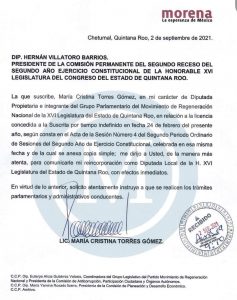 El 24 de febrero del año pasado Torres Gómez solicitó licencia por tiempo indefinido para contender en el Proceso Interno de Selección de Candidatos de Morena por la Presidencia Municipal de Solidaridad.