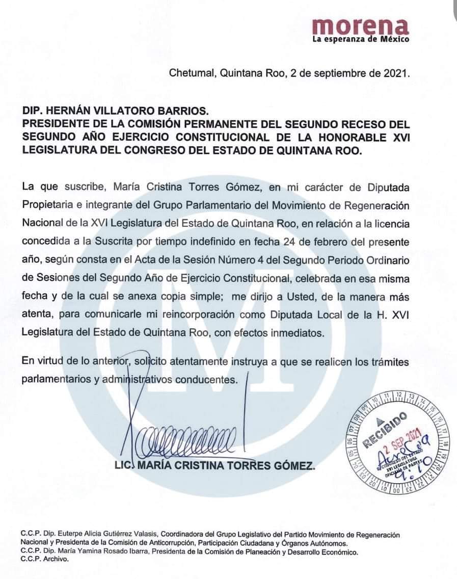 Chetumal, Q. Roo, Jueves 02 de Septiembre de 2021, poderycrítica.- La diputada María Cristina Torres Gómez anunció su reincorporación a la XVI Legislatura. Sin embargo se sumará a la Fracción Parlamentaria de Morena.