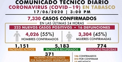 En cuanto a la distribución del COVID-19 por municipios, seis mil 188 registra el municipio de Centro; le sigue Nacajuca con 974; Cárdenas 877; Macuspana 856; Jalpa de Méndez 584; Comalcalco 573; Cunduacán 548; Huimanguillo 433; Tenosique 417; Paraíso 390; Teapa 385; Centla 297; Tacotalpa 295; Balancán 278; Jalapa 255; Emiliano Zapata 186 y Jonuta 86 casos.