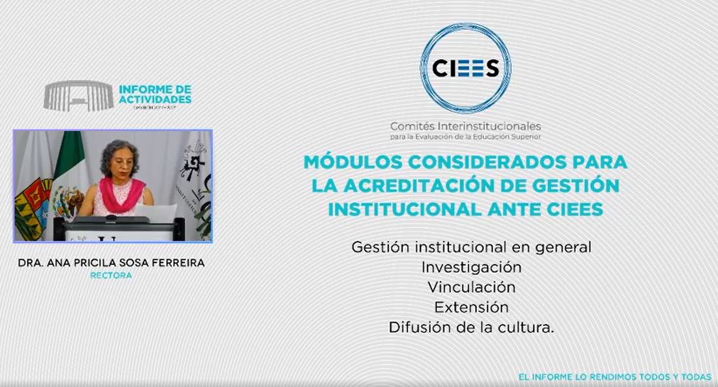Adicional a las certificaciones del Sistema de Gestión de la Calidad, en este ejercicio fiscal la Universidad se encuentra en proceso para obtener la Acreditación de la Gestión Institucional ante los Comités Interinstitucionales para la Evaluación de la Educación Superior (CIEES); el cual considera los módulos de gestión institucional en general, investigación, vinculación y extensión, así como la difusión de la cultura.