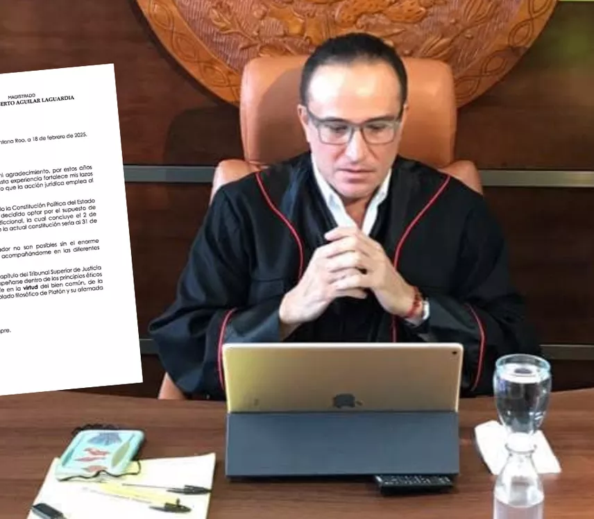 PODER Y CRÍTICA | REDACCIÓN | Durante la tarde del martes 18 de febrero, trascendió la renuncia de Mario Aguilar Laguardia, magistrado numerario del Poder Judicial de Quintana Roo. A través de una carta dirigida al personal judicial, Aguilar Laguardia anunció el fin de su labor como impartidor de justicia, cargo que ocupó desde 2011 y que estaba previsto concluir en diciembre de este 2025.