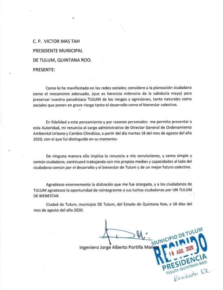 Tulum, Q. Roo, Martes 18 de Agosto de 2020, poderycrítica.- Por motivos personales, Jorge Portilla Manica presentó su renuncia a la Dirección General de Ordenamiento Ambiental y Urbano en Tulum.