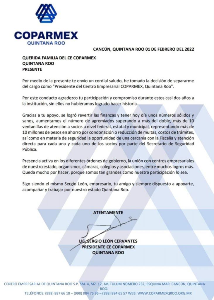 PODER Y CRÍTICA | REDACCIÓN | Por motivos personales, Sergio León Cervantes, presentó anoche su renuncia como dirigente del Centro Empresarial Coparmex en Quintana Roo.