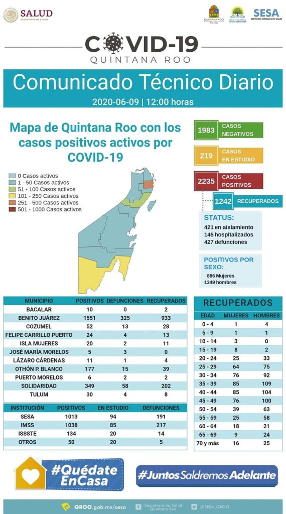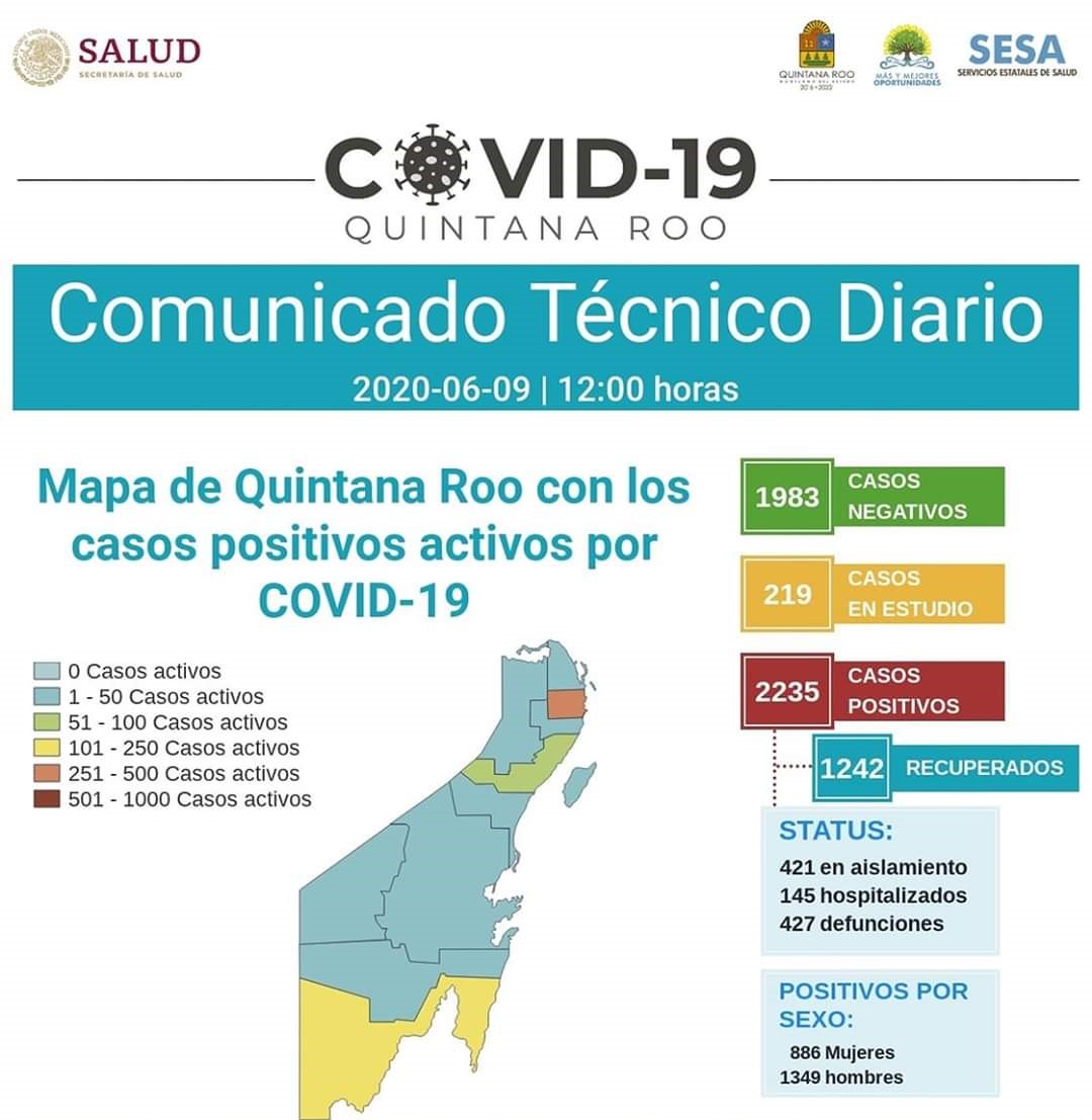 Hasta las 12 horas del 09 de junio, se han notificado 1983 casos negativos, 219 en estudio, 2235 positivos, 427 defunciones y 1242 personas recuperadas a Covid-19″, detalló la dependencia.