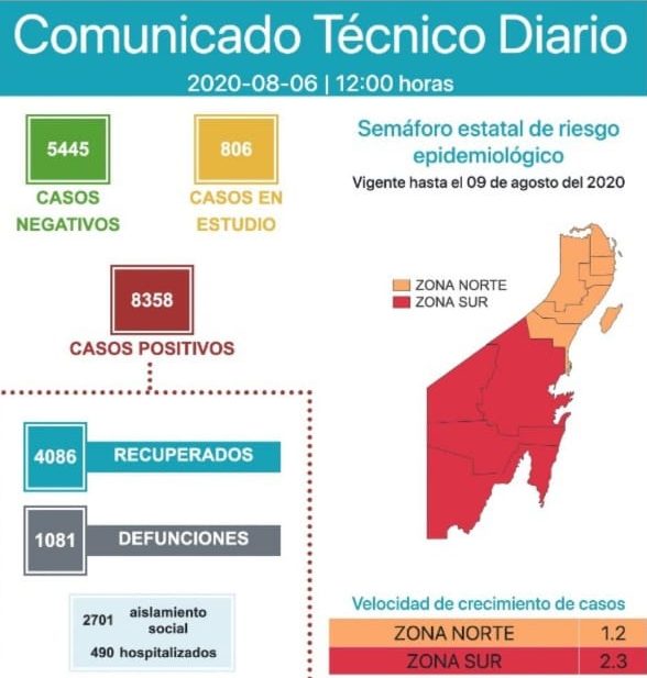 «Hasta las 12 horas del 06 de agosto, se han notificado 4 mil 86 personas recuperadas, 5 mil 445 casos negativos, 806 casos en estudio, 8 mil 358 casos positivos y 1081 defunciones relacionadas a Covid 19», detalló la dependencia.